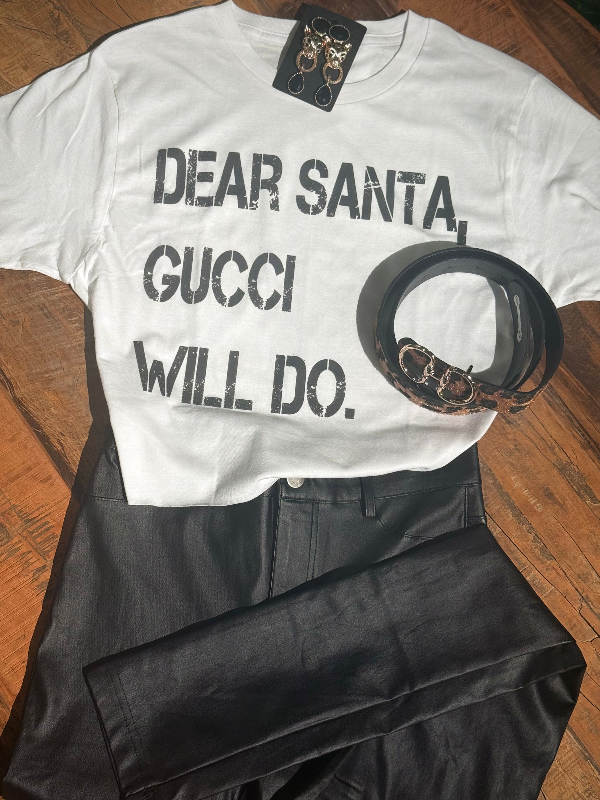 A fun and festive crop top featuring the bold statement “Dear Santa, Gucci Will Do.” Perfect for holiday parties, casual outings, or gifting season, this playful tee adds a stylish touch with its relaxed fit and modern cropped length.