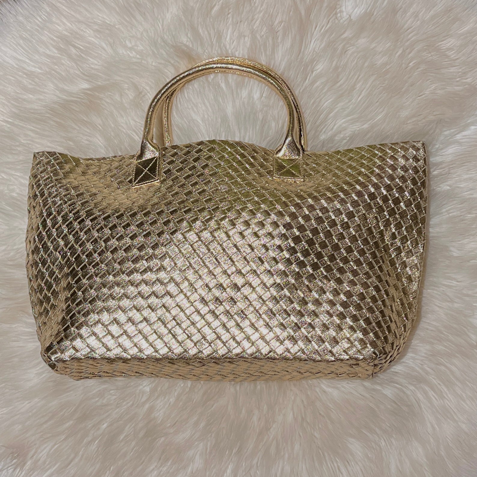 A stylish gold woven beach bag designed with a metallic finish that adds a touch of glamour to any warm-weather look. Its spacious interior and durable woven texture make it perfect for beach days, vacations, or everyday sunny-day outings.